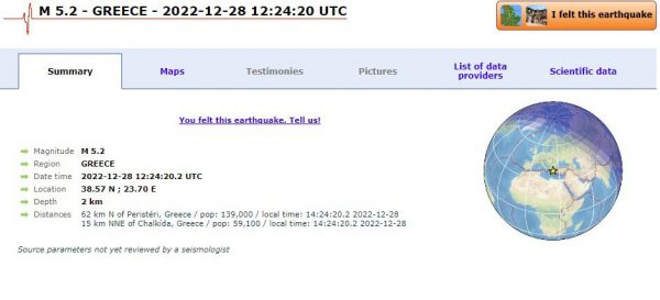 Σύμφωνα με το Ευρωμεσογειακό Ινστιτούτο η σεισμική δόνηση είχε μέγεθος 5,2 Ρίχτερ.