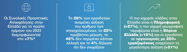 Το πρόσημο του συνολικού αφηγήματος για τις Προοπτικές Απασχόλησης παραμένει θετικό για όλους σχεδόν τους κλάδους καθώς οι έλληνες εργοδότες αναμένουν αύξηση του ρυθμού προσλήψεων σε 7 από τους 9 κλάδους το α’ τρίμηνο του 2023, ενώ στoν κλάδο της Επικοινωνίας δεν αναμένεται διαφοροποίηση και μόνο στις «Λοιπές Υπηρεσίες» προβλέπεται μείωση κατά 6%.