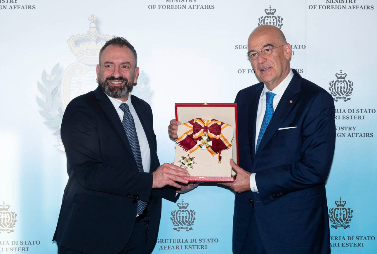 Ο Νίκος Δένδιας παρασημοφορήθηκε με το Μεγάλο Σταυρό Έφιππου Τάγματος της Sant’Agata (Προστάτιδας Αγίου Μαρίνου), ενώ απηύθυνε πρόσκληση στον υπουργό Εξωτερικών του Αγίου Μαρίνου, Λούκα Μπεκάρι να επισκεφθεί την Ελλάδα το συντομότερο δυνατό.