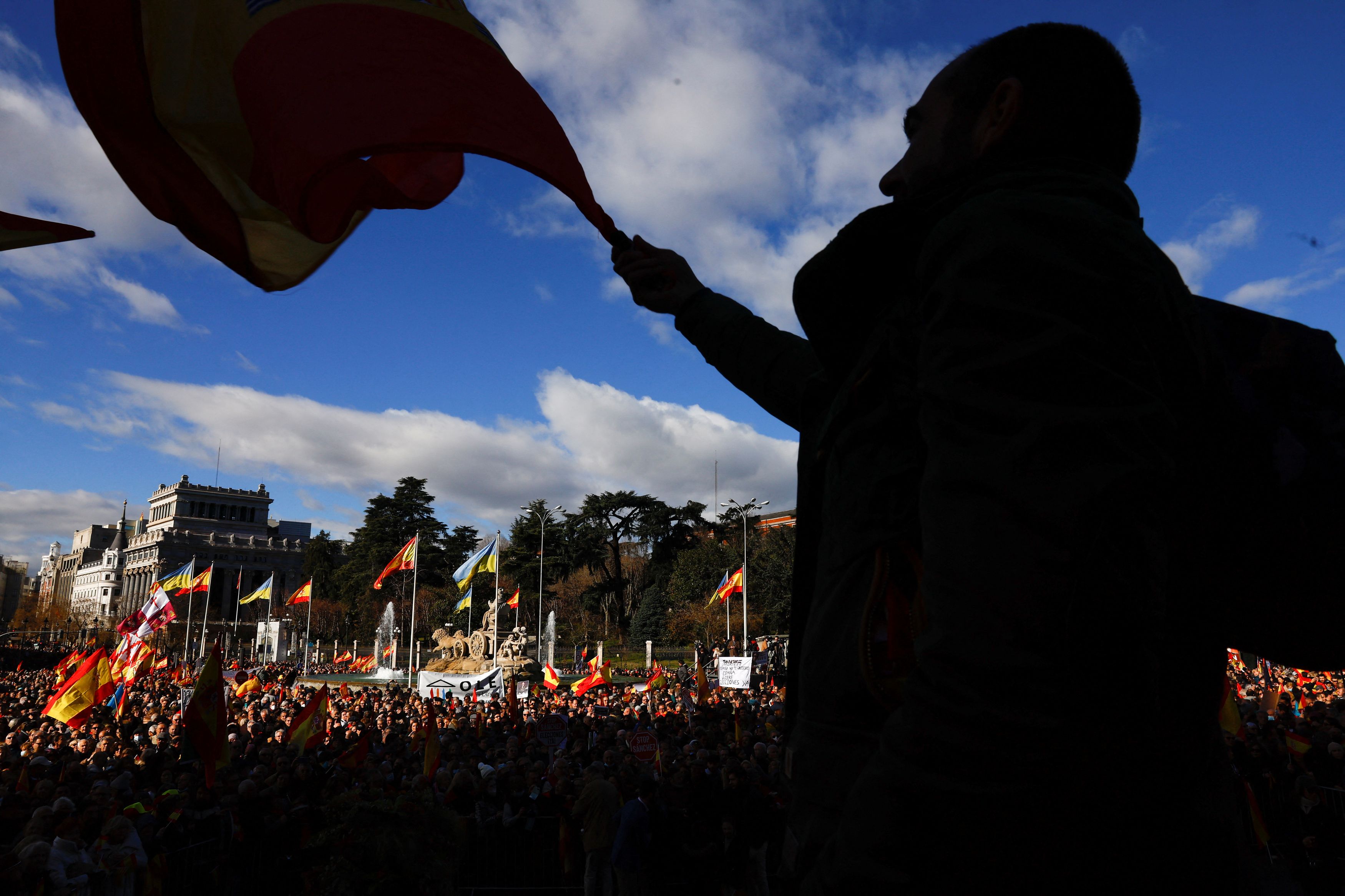Οι διαδηλωτές συγκεντρώθηκαν στην Πλάθα ντε Σιμπέλες μπροστά από το Δημαρχείο κρατώντας ισπανικές σημαίες, καλώντας τον πρωθυπουργό Πέδρο Σάντσεθ να παραιτηθεί και φωνάζοντας «προδότη».