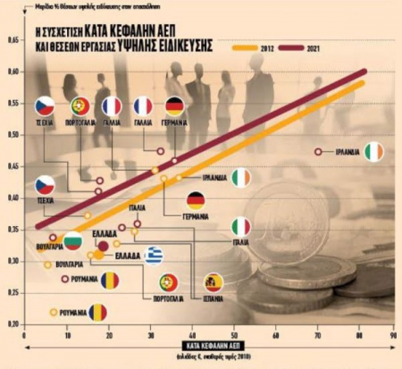 Ο πιό ασφαλής, ίσως, δείκτης για την δυνητική και πραγματική παραγωγικότητα μίας οικονομίας, και κατά συνέπειαν για τον αναπτυξιακό της δυναμισμό, είναι το ποσοστό των εργαζομένων “υψηλής ειδίκευσης”, δηλαδή μεγάλης παραγωγικότητας. Στο διάγραμμα παρουσιάζεται η ευθεία συσχέτιση του κατά κεφαλήν ΑΕΠ και του μεριδίου θέσεων εργασίας υψηλής ειδίκευσης στο σύνολο της απασχόλησης, για τις χώρες της Ευρωπαϊκής Ένωσης, με στοιχεία του 2012-2021 για όλα τα κράτη-μέλη της ΕΕ. Το αξιοσημείωτο δεν είναι μόνον η σχετική χαμηλή θέση της Ελλάδας. Είναι και ότι στη δεκαετία 2012-2021 η Ελλάδα αύξησε μόλις κατά μία ποσοστιαία μονάδα το μερίδιο των θέσεων απασχόλησης υψηλής ειδίκευσης / υψηλών δεξιοτήτων (από 31% σε 32%) και κατά 0,67 χιλ. ευρώ το κατά κεφαλήν ΑΕΠ σε σταθερές τιμές 2010. Κατέχει έτσι την (τελευταία) 27η και την (τρίτη από το τέλος) 25η θέση στις σχετικές κατατάξεις μεταξύ των χωρών της ΕΕ. Η δε ελάχιστη βελτίωσή της είναι προϊόν της διετίας 2020-2021.