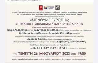 Η εκδήλωση διοργανώνεται αύριο στο Ινστιτούτο Γκαίτε από την Ελληνική Ένωση για τα Δικαιώματα του Ανθρώπου, την Πρωτοβουλία για την Υπεράσπιση της Δημοκρατίας και του Κράτους Δικαίου και τη Σχολή Πολιτικών Επιστημών του Παντείου Πανεπιστημίου για το σκάνδαλο των υποκλοπών.