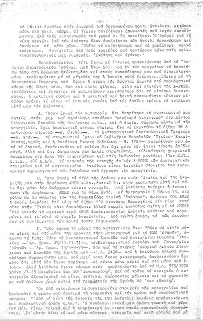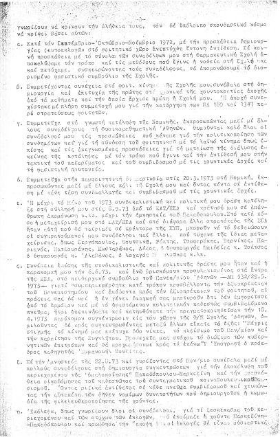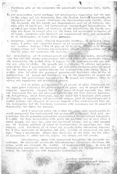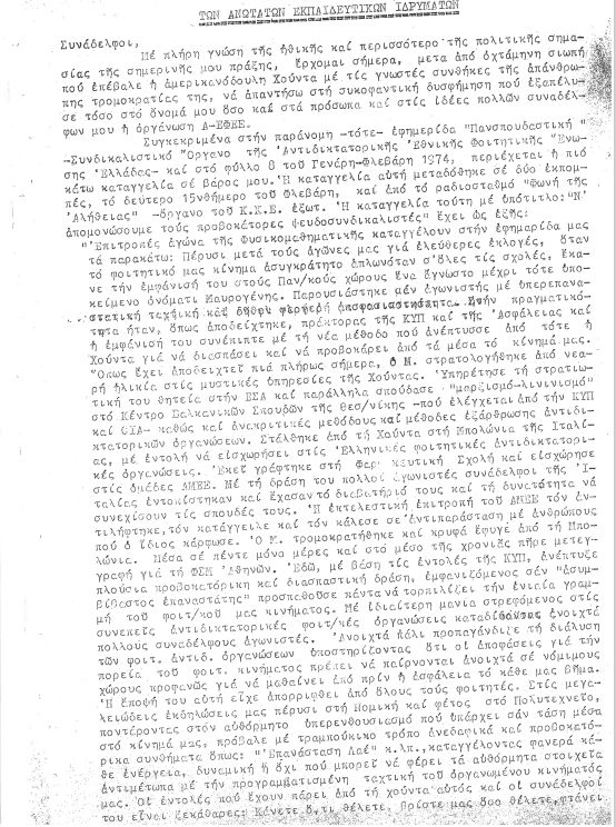 «Η πενταμελής επιτροπή της Φυσικομαθηματικής Σχολής που εκλέχτηκε στη Γενική Συνέλευση της Σχολής στις 16 Νοέμβρη στο Πολυτεχνείο και μετείχε στη Συντονιστική Επιτροπή, καθώς και οι υπογράφοντες συνδικαλιστές-φοιτητές των ΑΕΙ, δηλώνουμε κατόπιν της δημοσιευθείσης στον τύπο ανοιχτής επιστολής του μέλους τής εν λόγω επιτροπής και γνωστού συνδικαλιστή του Πανεπιστημίου Αθηνών, Διονύση Μαυρογένη, ότι καταδικάζουμε την εκ μέρους της Αντι-ΕΦΕΕ εξαπολυθείσα ύπουλη συκοφαντική δυσφήμηση κατά του εν λόγω συναδέλφου και συγκρατούμενού μας στα άντρα της ΕΣΑ. Δηλώνουμε ότι τέτοιες πράξεις, ευρίσκονται σε αντίθεση με τις αρχές του φοιτητικού κινήματος και την ηθική και αγωνιστική εντιμότητα. Παρέχουμε την αμέριστη συμπαράστασή μας στο συνάδελφο και καλούμε τους φοιτητές να διαφοροποιήσουν τη θέση των σε σχέση με τη βρώμικη αυτή ενέργεια».