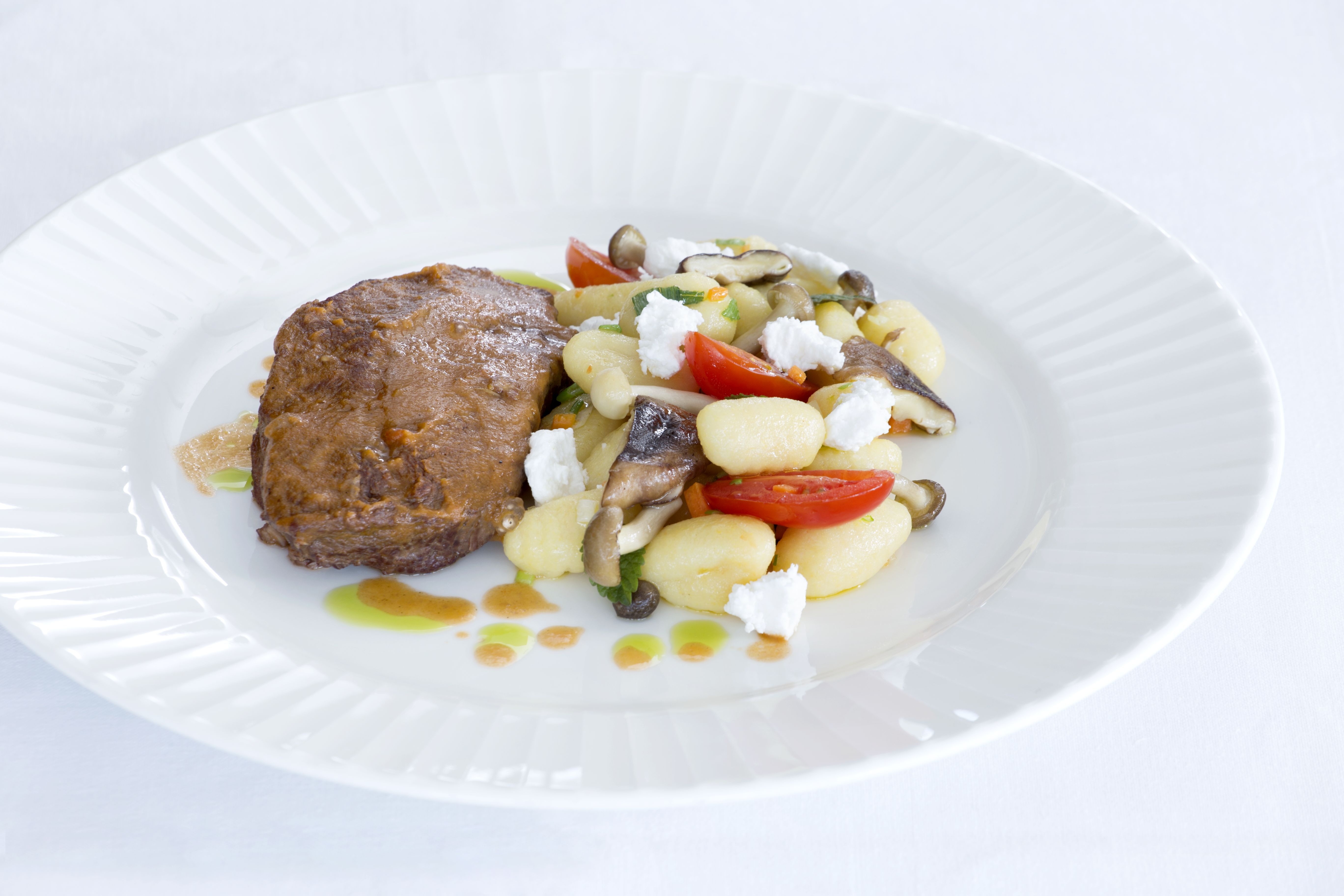 Αφού μαγειρευτεί το κρέας, ετοιμάζουμε τα νιόκι: Ρίχνουμε σε μια κατσαρόλα μπόλικο αλατισμένο νερό. Οταν αρχίσει να κοχλάζει, προσθέτουμε τα νιόκι και τα βράζουμε για 5 λεπτά. Τα στραγγίζουμε. Ρίχνουμε σε ένα τηγάνι το βούτυρο, 1 κουτ. σούπας ελαιόλαδο, το σκόρδο, το φρέσκο κρεμμυδάκι, τα μανιτάρια και τα ντοματίνια και σοτάρουμε σε χαμηλή φωτιά για περίπου 15 λεπτά. Προσθέτουμε τα νιόκι μαζί με 3 κουτ. σούπας από τη σάλτσα του κρέατος. Τα γυρνάμε λίγο να πάρουν από τη σάλτσα. Σερβίρουμε το χτένι μας με τα νιόκι δίπλα και γαρνίρουμε με βασιλικό και 50 γρ. φρέσκο ανθότυρο.