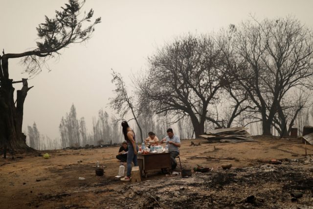 Κάτοικοι γευματίζουν, στην κατεστραμμένη ύπαιθρο μετά από πυρκαγιά που έκαψε περιοχές στη Σάντα Χουάνα, κοντά στην Κονσεπσιόν, Χιλή, 5 Φεβρουαρίου 2023. REUTERS/Juan Gonzalez