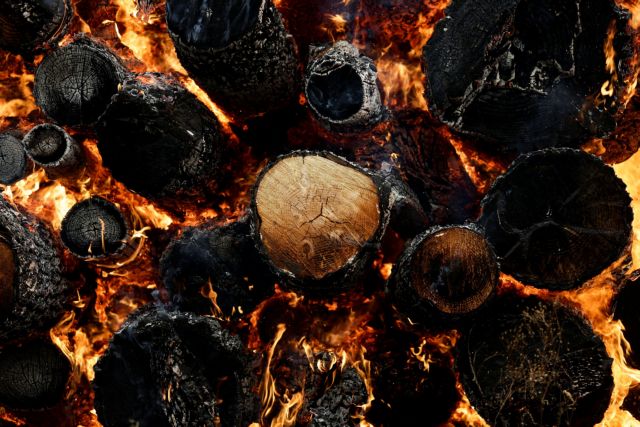 Στοιβαγμένα ξύλα καίγονται κατά τη διάρκεια πυρκαγιάς στη Σάντα Χουάνα, κοντά στο Κονσεπσιόν της Χιλής, 6 Φεβρουαρίου 2023. REUTERS/Juan Gonzalez