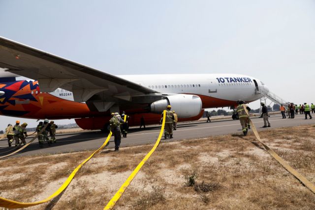 Ένα πυροσβεστικό αεροσκάφος DC-10 Ten Tanker, στο αεροδρόμιο της Concepcion μετά την άφιξή του για την κατάσβεση πυρκαγιών στις 6 Φεβρουαρίου 2023. REUTERS/Juan Gonzalez
