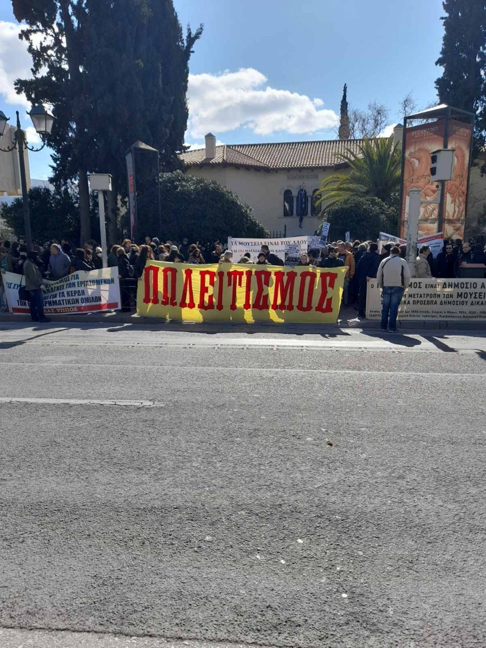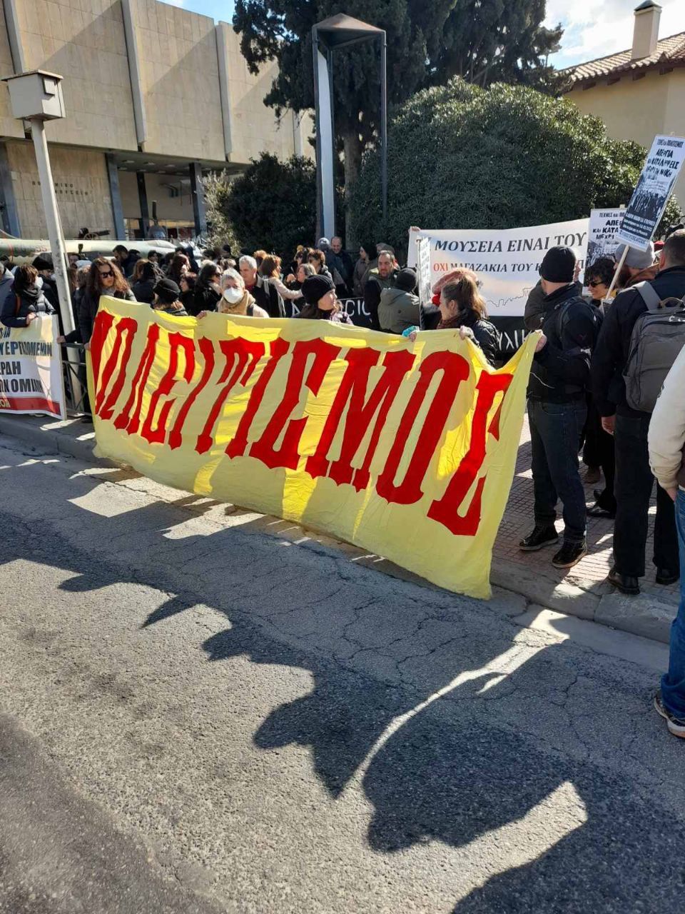 Με ένα τεράστιο πανό που ο Πολιτισμός γράφεται ως «ΠΩΛΕΙΤΙΣΜΟΣ»,  διαμαρύρονται για τα όσα προωθεί το υπουργείο τους για τα Μουσεία της χώρας.