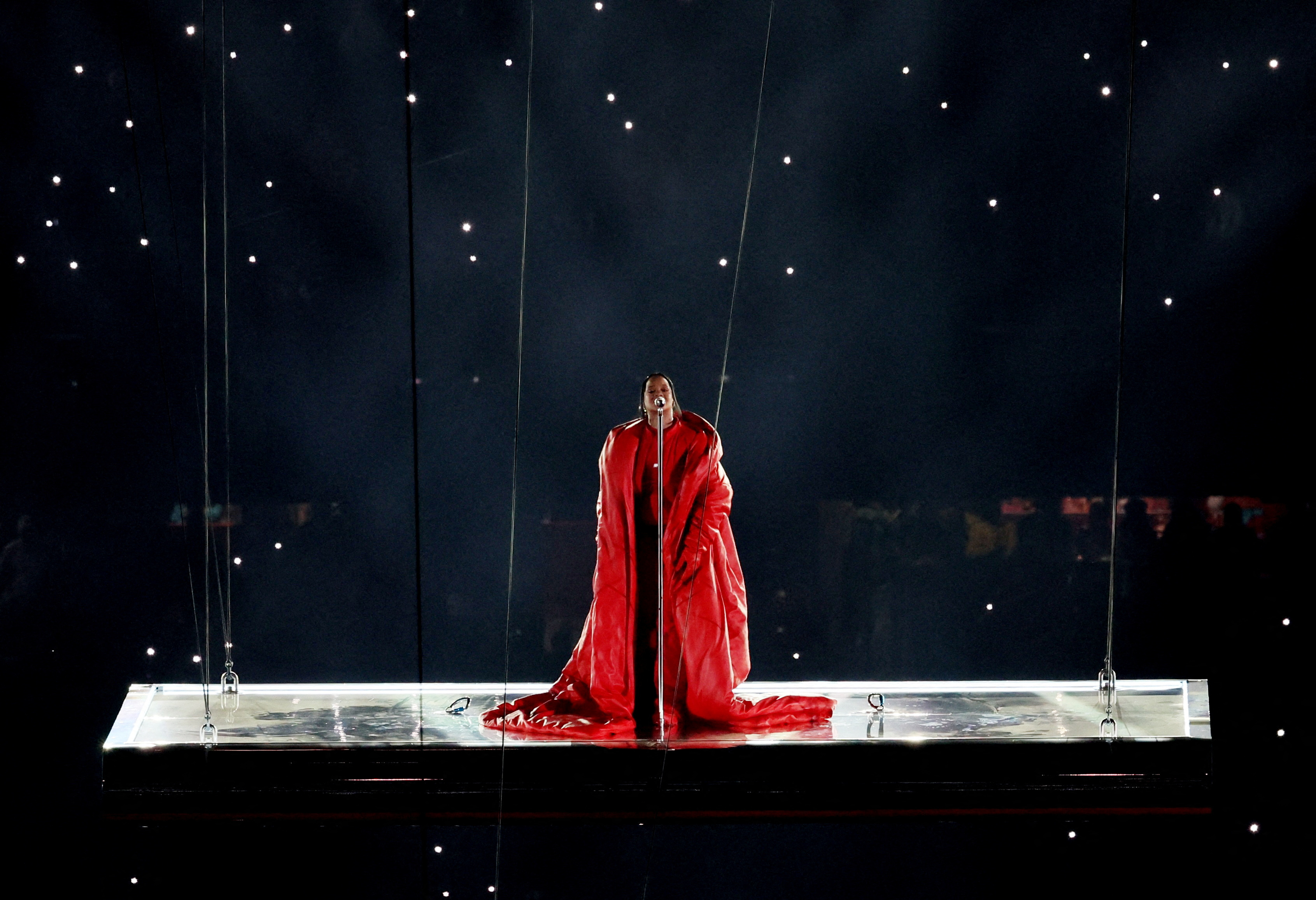 Η 34χρονη τραγουδίστρια ντυμένη στα κατακόκκινα, εμφανίστηκε στη σκηνή του Super Bowl 2023, στη διάρκεια του ημιχρόνου, χαϊδεύοντας την κοιλιά της και αφήνοντας ανοιχτό το φερμουάρ του outfit της -μια ολόσωμη φόρμα πάνω από ένα εφαρμοστό κορμάκι- ώστε να φαίνεται, επιβεβαιώνοντας ο,τι περιμένει το δεύτερο παιδί της.