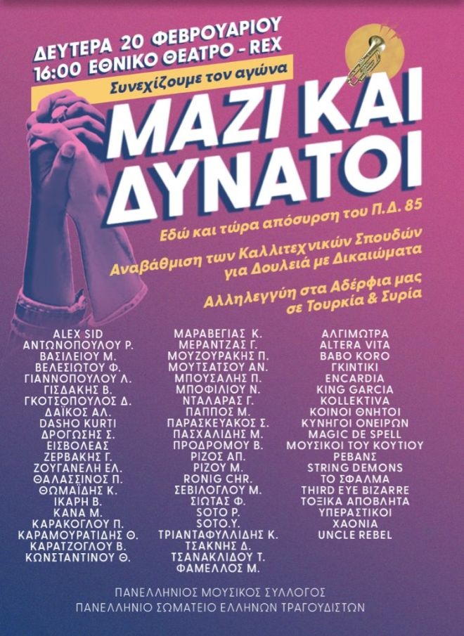 Μεγάλη συναυλία διοργανώνει ο Πανελλήνιος Μουσικός Σύλλογος και το Πανελλήνιο Σωματείο Ελλήνων Καλλιτεχνών για τη Δευτέρα 20 Φλεβάρη στο ήδη κατειλημμένο REX. Με σύνθημα «Συνεχίζουμε τον αγώνα ΜΑΖΙ ΚΑΙ ΔΥΝΑΤΟΙ», τα δύο σωματεία ζητούν την απόσυρση του Προεδρικού Διατάγματος που υποβαθμίζει τα πτυχία τους.
