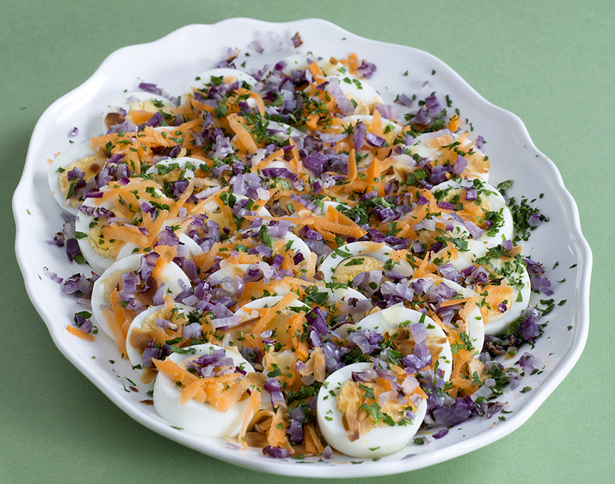 Προθερμαίνουμε τον φούρνο στους 180οC. Ψιλοκόβουμε τα ξερά κρεμμύδια. Σε ένα ταψί απλώνουμε μια λαδόκολλα, βάζουμε τα ψιλοκομμένα κρεμμύδια και τα ψήνουμε στον φούρνο για 15 λεπτά μέχρι να μαλακώσουν. Οταν κρυώσουν, τα ρίχνουμε στην πιατέλα, πάνω από τα αβγά.