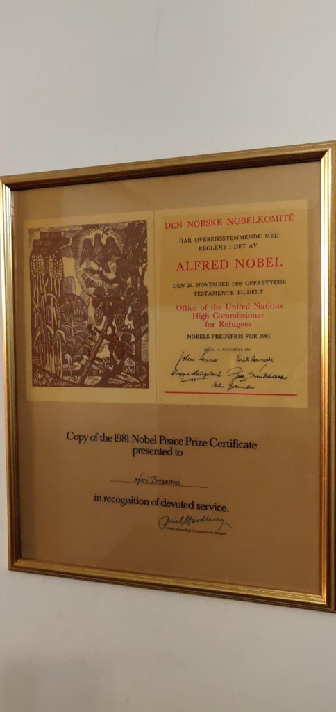 Η Ύπατη Αρμοστεία του ΟΗΕ για τους πρόσφυγες τιμήθηκε με το Νόμπελ Ειρήνης για τη συμβολή της στο προσφυγικό το 1981. Η αναφορά στη Χάρη Μπρισίμη, τότε Διευθύντρια του Γραφείου του Οργανισμού στη Γενεύη, αναγράφεται πάνω στο αντίγραφο του Νόμπελ υπογεγραμμένο από τον Ύπατο Αρμοστή: «To Hari Brissimi, in recognition of devoted service» (Στη Χάρη Μπρισίμη, σε αναγνώριση αφοσιωμένης υπηρεσίας). Και φυσικά, η ύψιστη διάκριση εξακολουθεί να κάνει περήφανους τους δικούς της ανθρώπους.