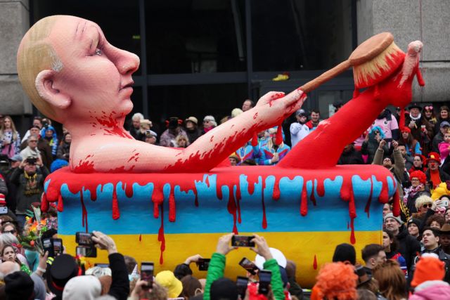 Ένα καρναβαλικό άρμα που απεικονίζει τον Ρώσο πρόεδρο Βλαντιμίρ Πούτιν να κάνει μπάνιο στο αίμα, στην καρναβαλική παρέλαση “Rosenmontag” (Δευτέρα των Ρόδων) στο Ντίσελντορφ της Γερμανίας, 20 Φεβρουαρίου 2023. REUTERS/Thilo Schmuelgen