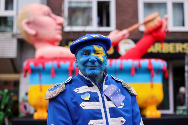 Ο Ρώσος πρόεδρος Βλαντιμίρ Πούτιν και η πρόεδρο της Ευρωπαϊκής Επιτροπής Ούρσουλα φον ντερ Λάιεν κατά τη διάρκεια της καρναβαλικής παρέλασης “Rosenmontag” (Δευτέρα των Ρόδων) στο Μάιντς της Γερμανίας, 20 Φεβρουαρίου 2023. REUTERS/Kai Pfaffenbach