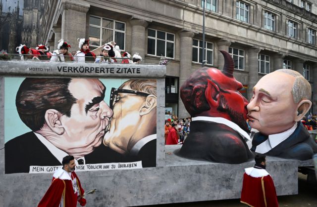 O Βλαντιμίρ Πούτιν φιλάει τον διάβολο φαίνεται κατά τη διάρκεια της καρναβαλικής παρέλασης “Rosenmontag” (Δευτέρα των Ρόδων) στην Κολωνία της Γερμανίας, 20 Φεβρουαρίου 2023. REUTERS/Jana Rodenbusch
