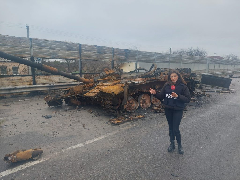 Κάποια αυτοκίνητα γράφουν με μεγάλα γράμματα «παιδιά», είναι όμως γαζωμένα με σφαίρες. Στο έδαφος έχουν σχηματιστεί ολόκληροι κρατήρες. Δεξιά και αριστερά του δρόμου ρωσικά και ουκρανικά κατεστραμμένα τανκς.