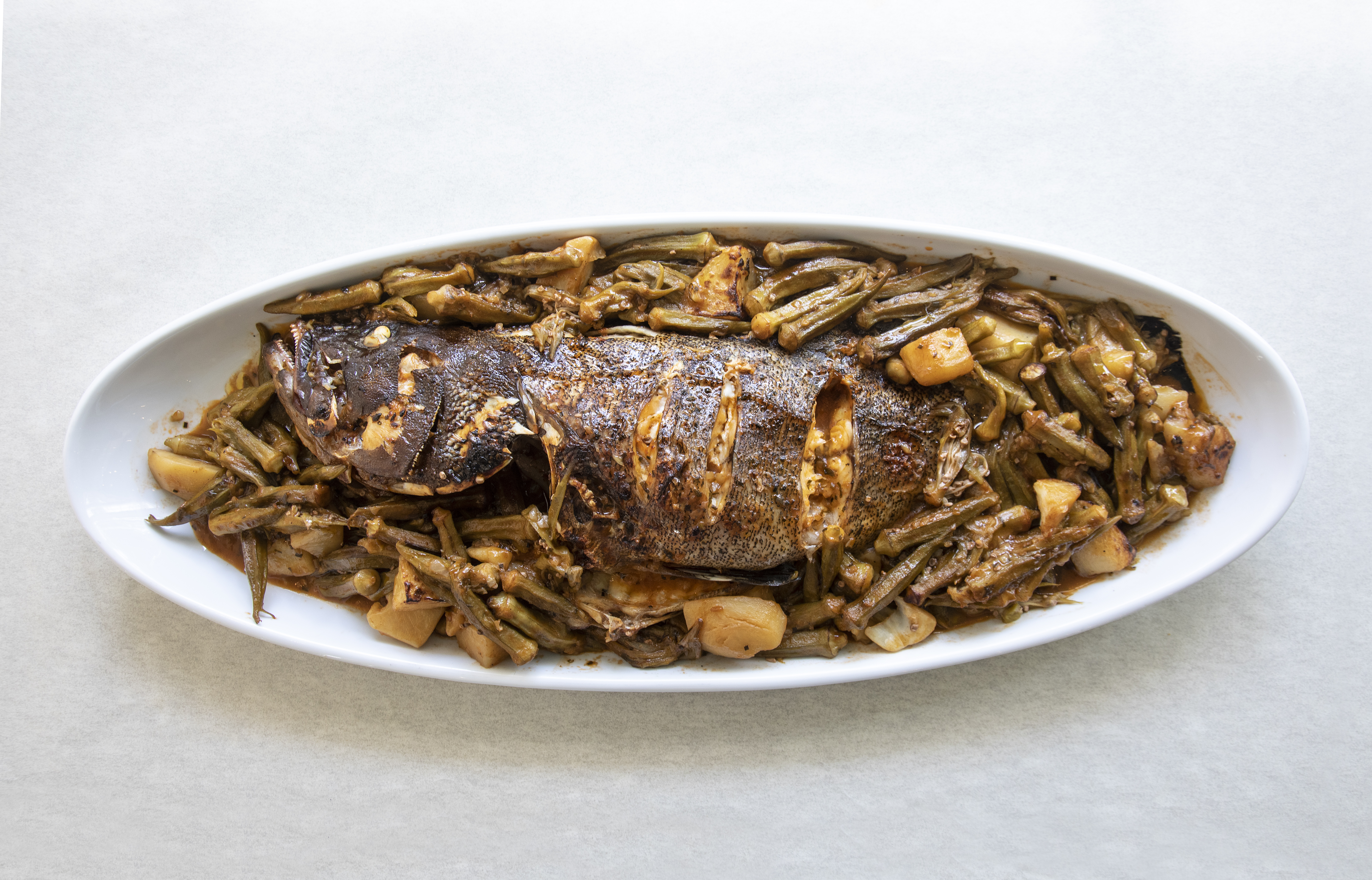 Στο μεταξύ, επιλέγουμε το σκεύος (ταψί ή πυρέξ) που θα ψήσουμε τις μπάμιες με το ψάρι. Θέλουμε να χωράει καλά το ψάρι αλλά να μην είναι πολύ μεγαλύτερο. Στρώνουμε τις μπάμιες έτσι ώστε να καλύπτει η μία την άλλη – να μην καλύπτεται μόνο το κεφάλι τους. Προθερμαίνουμε τον φούρνο στους 160οC. Αλατοπιπερώνουμε το ψάρι εξωτερικά και εσωτερικά και το βάζουμε πάνω από τις μπάμιες. Περιχύνουμε με τη σύβραση (κρεμμύδι, σκόρδο και πελτέ) και περίπου 50 ml ελαιόλαδο. Βρέχουμε μια λαδόκολλα, καλύπτουμε το ταψί και κλείνουμε με αλουμινόχαρτο.