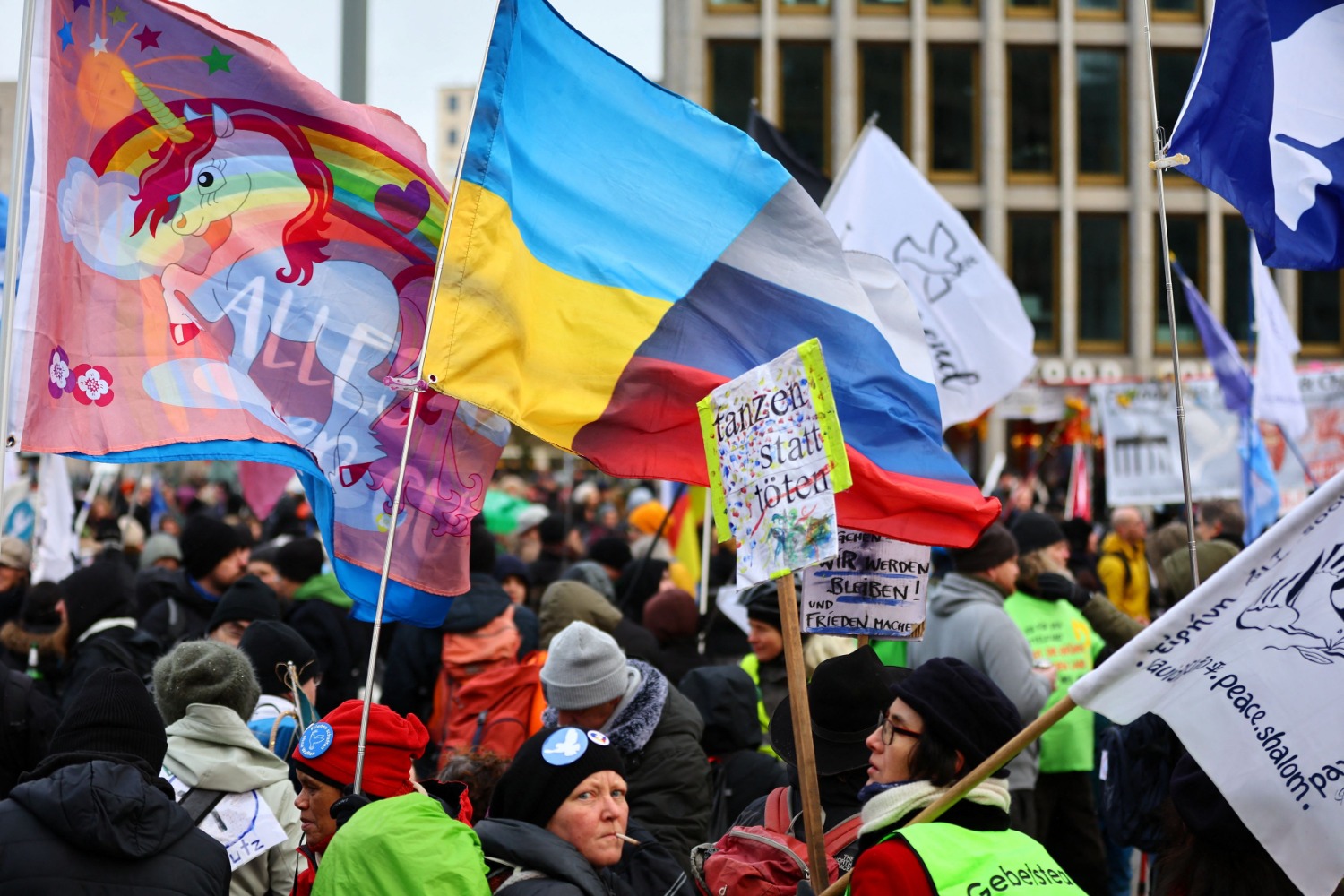 Περίπου 10.000 άνθρωποι, σύμφωνα με την αστυνομία, συγκεντρώθηκαν σήμερα στο κέντρο του Βερολίνου διαδηλώνοντας υπέρ των διαπραγματεύσεων με την Μόσχα και ενάντια στην παράδοση όπλων στην Ουκρανία, ένα χρόνο και μία ημέρα μετά την έναρξη της ρωσικής εισβολής.