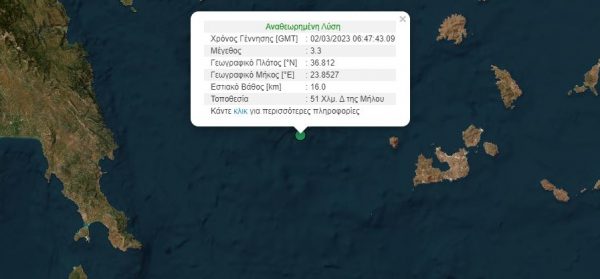 Σύμφωνα με την αναθεωρημένη λύση, ο σεισμός σημειώθηκε στις 8:47 το πρωί, είχε μέγεθος 3,3 βαθμών της κλίμακας Ρίχτερ και το επίκεντρο εντοπίστηκε 51 χιλιόμετρα δυτικά της Μήλου, ενώ το εστιακό βάθος προσδιορίστηκε στα 16 χιλιόμετρα.