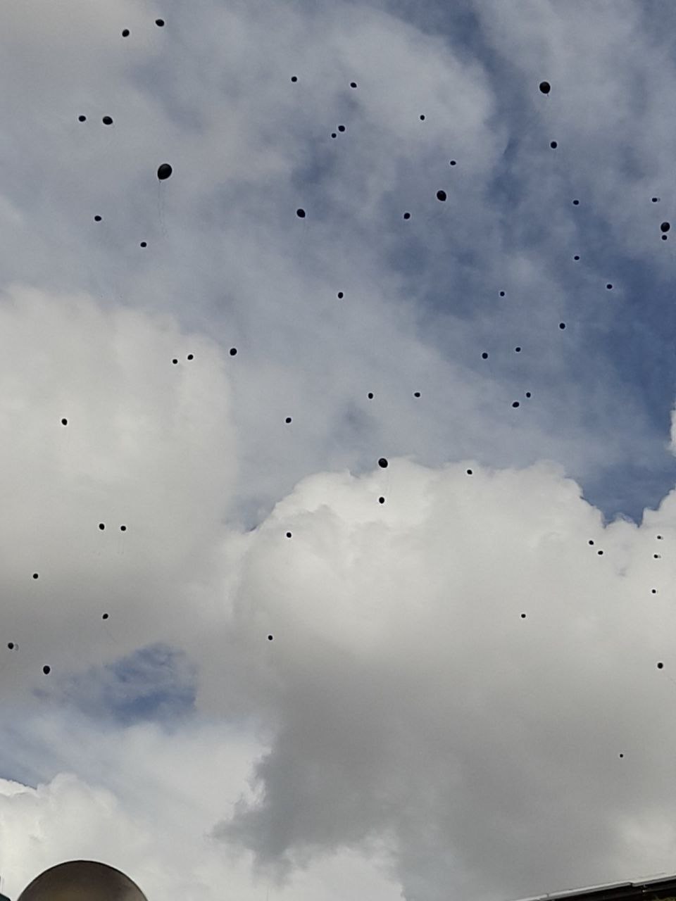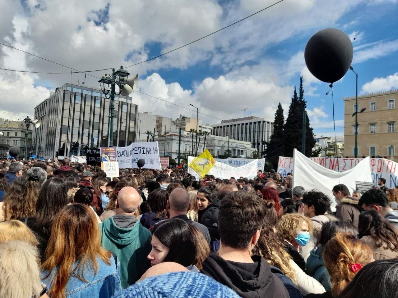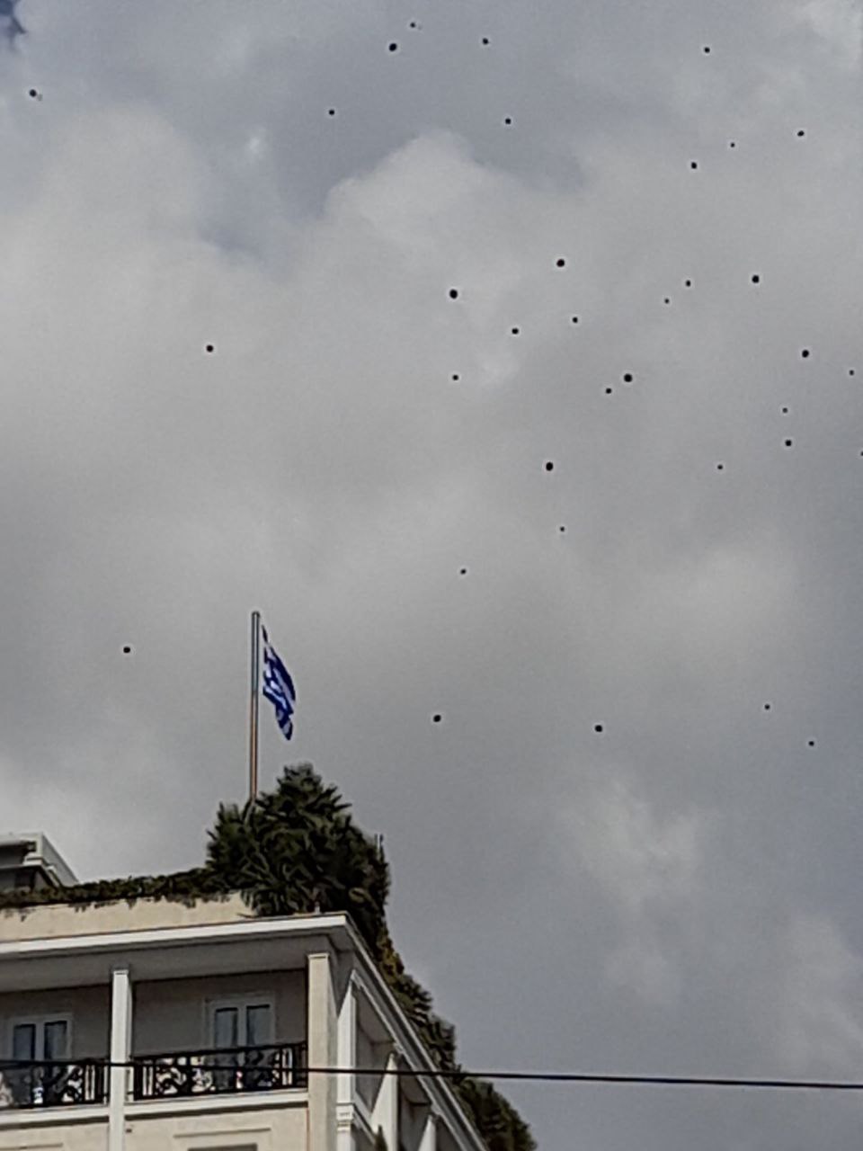 Στον ουρανό δεκάδες μαύρα μπαλόνια πένθους, για τις ψυχές των νέων ανθρώπων που τόσο άδικα άφησαν την τελευταία τους πνοή κατά την πρόσκρουση των αμαξοστοιχιών στα Τέμπη, άφησαν στον ουρανό της Αθήνας οι χιλιάδες διαδηλωτές που αυτήν την ώρα διαδηλώνουν στο Σύνταγμα διαμαρτυρόμενοι για την τραγωδία.