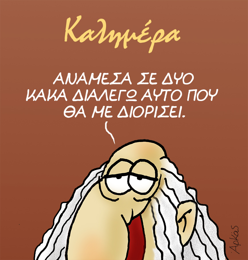 «Ανάμεσα σε δύο κακά, διαλέγω αυτό που θα με διορίσει», είναι η ατάκα του Προφήτη του Αρκά τον οποίο επιστρατεύει ο σκιτσογράφος προκειμένου να θίξει τα κακώς κείμενα στην υπόθεση του τραγικού σιδηροδρομικού δυστυχήματος στα Τέμπη.