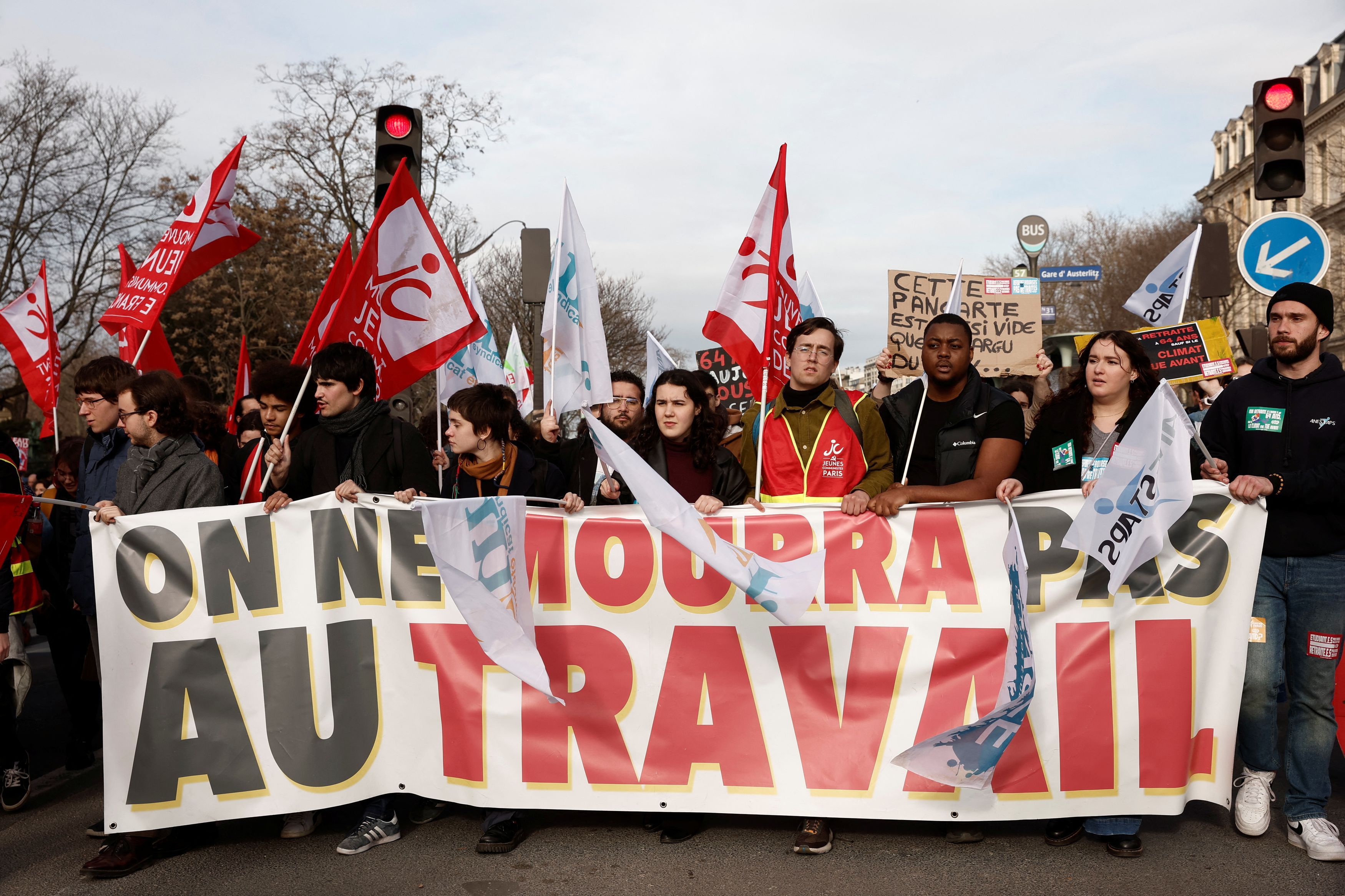 «Στοπ στη Γαλλία» είναι ένα από τα σλόγκαν των ενωμένων συνδικάτων, διοργανωτών της απεργίας που θα πραγματοποιηθεί αύριο, Τρίτη, 07-02-2023 στη Γαλλία με στόχο την παράλυση της χώρας ενόψει της μεταρρύθμισης του συνταξιοδοτικού και προκειμένου να υποχρεωθούν, κυβέρνηση και ο πρόεδρος Μακρόν, να υποχωρήσουν. Και για να επιτύχουν το στόχο τους αυτό τα συνδικάτα, δηλώνουν ότι θα συνεχίσουν την απεργία τους τουλάχιστον την Τετάρτη και την Πέμπτη.