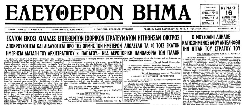 «ΤΟ ΒΗΜΑ», 16.3.1941, Ιστορικό Αρχείο «ΤΟ ΒΗΜΑ» | «ΤΑ ΝΕΑ»