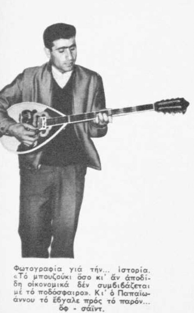 – Να σας πω. Τώρα το ποδόσφαιρο με απασχολεί ολοκληρωτικά. Δεν γίνεται μπάλλα και μπουζούκι μαζί, γιατί όποιος κυνηγά πολλούς λαγούς…Όμως στον μικρό, στον ελάχιστο μάλλον ελεύθερο χρόνο που μου μένει, ασχολούμαι λίγο με το λαϊκό τραγούδι, που τόσο πολύ μ’ αρέσει. Έχω ήδη γράψει ένα δίσκο για την ΑΕΚ με μουσική και στίχους του Καζατζίδη, που σύντομα θα κυκλοφορήση.