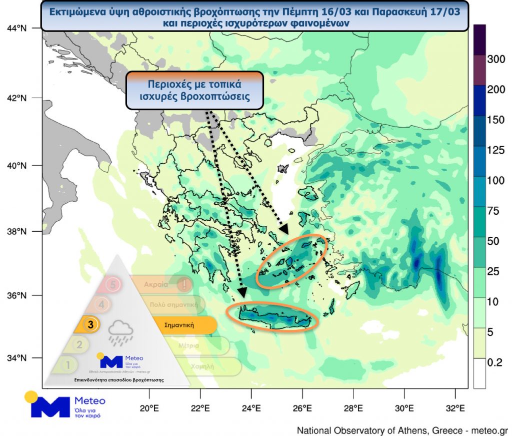 – Σύμφωνα με την κατηγοριοποίηση του επεισοδίου βροχόπτωσης (RPI), η οποία εφαρμόζεται από τη μονάδα Meteo του Εθνικού Αστεροσκοπείου Αθηνών, το αναμενόμενο επεισόδιο βροχόπτωσης κατά τη διάρκεια της Παρασκευής 17/03 κατατάσσεται στην Κατηγορία 3 (Σημαντική).