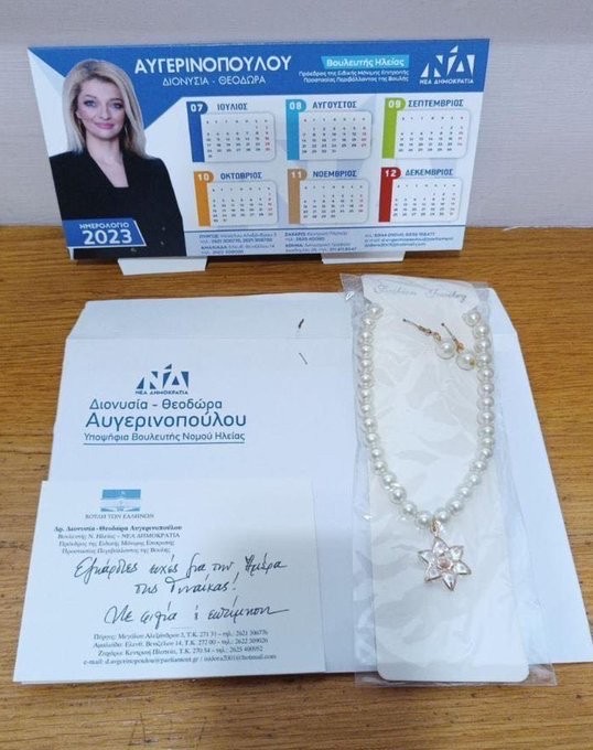 Αντί για λουλούδια (που όπως λέει την άλλη μέρα τα πετάς) έστειλε σε γυναίκες της εκλογικής της περιφέρειας… πέρλες σε… κολιέ και σε ζευγάρι σκουλαρίκια. Η βουλευτής της ΝΔ και υποψήφια στο Νομό Ηλείας Διονυσία- Θεοδώρα Αυγερινοπούλου πρωτοτύπησε: Πρόσφερε αυτό το κολιέ με τις πέρλες και τα σκουλαρίκια για να τιμήσει την Ημέρα της Γυναίκας, όπως είπε. Έτσι επικοινώνησε με τις γυναίκες η βουλευτής με τη σημείωση «εγκάρδιες ευχές για την Ημέρα της Γυναίκας, με φιλία και εκτίμηση». Σας είπα ότι η περιφέρεια της Ηλείας είναι πολύ ενδιαφέρουσα στις επερχόμενες εκλογές. Τόσο που αποχώρησε από την εκλογική μάχη ένας υποψήφιος ο Βασίλης Κοντογιαννόπουλος (ετών 80) , ήρθε εκεί ένας «καινούργιος», ο Δημήτρης Αβραμόπουλος (ετών 69), μία νεοδημοκράτισσα η Κρινιώ Κανελλοπούλου (κόρη του αείμνηστου Θανάση Κανελλόπουλου), άλλαξε στρατόπεδο και οδεύει προς ΣΥΡΙΖΑ, ενώ σε προεκλογική περίοδο μοιράστηκαν κολιέ και σκουλαρίκια.