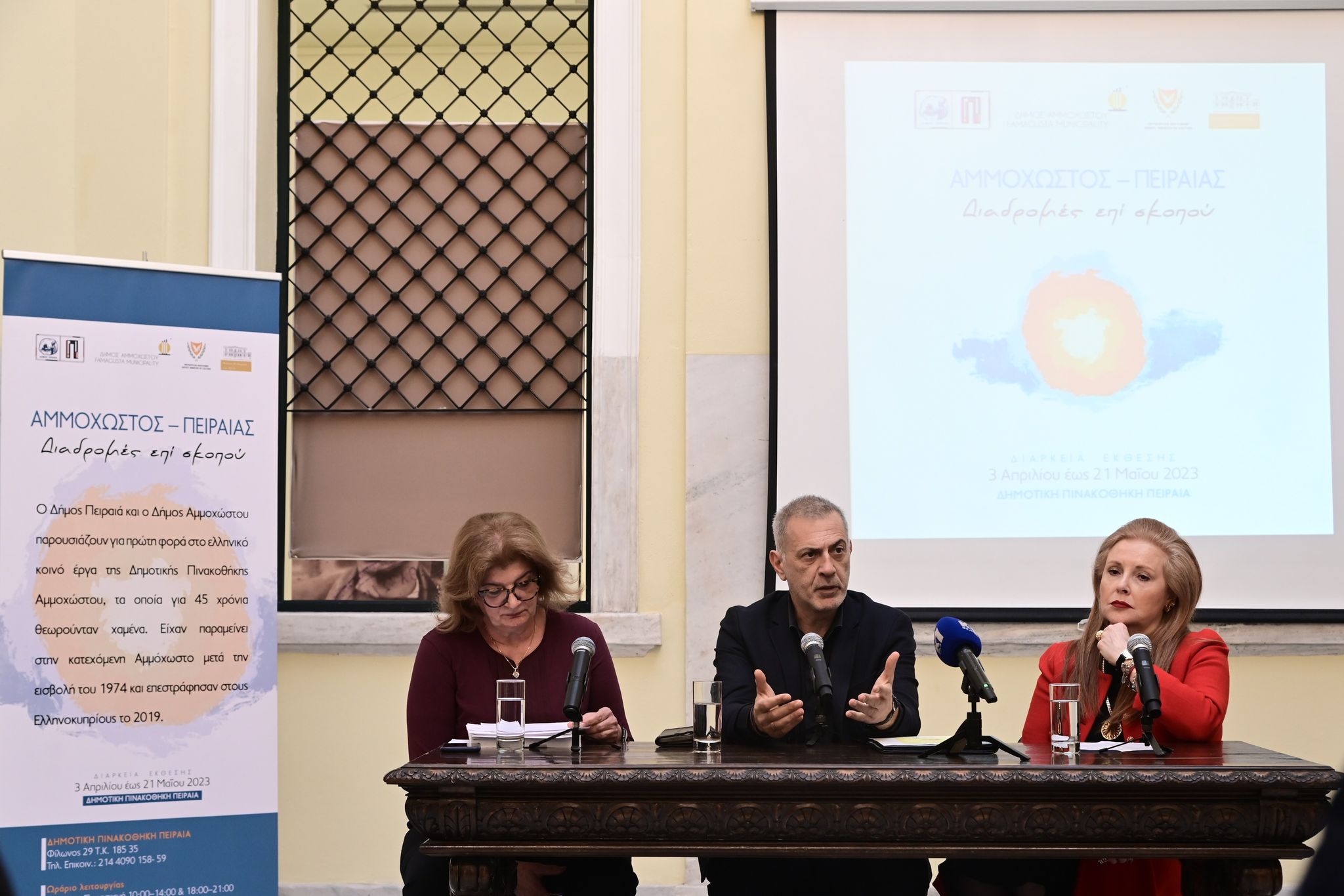 Ο Δήμαρχος Πειραιά μαζί με την κυρία Ειρήνη Νταϊφά Εντεταλμένη Δημοτική Σύμβουλο Πολιτισμού και την κυρία Ευαγγελία Μπαφούνη, Διευθύντρια Πολιτισμού του Δήμου, έδωσαν έμφαση στην ιστορία που υπάρχει πίσω από την έκθεση «Αμμόχωστος-Πειραιάς, Διαδρομές επί σκοπού». Μίλησαν κυρίως για το πως, τα έργα αυτά που μέχρι πριν από μερικά χρόνια θεωρούνταν χαμένα (και που στο σύνολό τους είναι 219), βρέθηκαν από τους Τουρκοκύπριους, επεστράφησαν στους Κυπρίους και σήμερα μέσω αυτής της έκθεσης (όπως και άλλων που ενδεχομένως να ακολουθήσουν) μπορούν να φέρουν και πάλι στη δημοσιότητα το τραύμα που έζησε η Αμμόχωστος («μια πόλη φάντασμα» ήταν ο χαρακτηρισμός του Δημάρχου Πειραιά) και γενικότερα η Κύπρος το 1974. Στην Δημοτική Πινακοθήκη Πειραιά θα εκτεθούν 25 έργα.