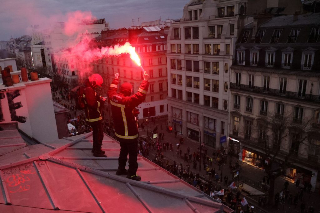Γάλλοι πυροσβέστες διαδηλώνουν στην ταράτσα κτιρίου στο Παρίσι