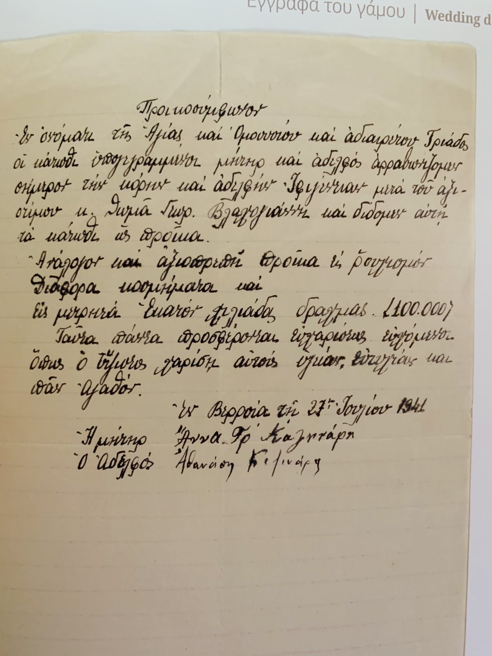 Ένα βιβλίο- λεύκωμα για τα 40 χρόνια του Λυκείου Ελληνίδων δίνει δώρο ο Πρόεδρος της Βουλής Κώστας Τασούλας σε βουλευτές (κυρίως σε γυναίκες βουλευτές). Το βιβλίο φέρει το τίτλο «Νύφες και Προικιά» και έχει τα πάντα μέσα πως γίνονταν οι γάμοι στις αρχές του προηγούμενου αιώνα. Εκείνο που ξεχωρίζει είναι ένα… προικοσύμφωνο, το οποίο έχει συνταχθεί πάνω σε ένα απλό χαρτί στις 27 Ιουλίου του 1941.Δηλαδή, ενώ υπήρχε η γερμανική κατοχή, η πείνα, αλλά και η ηρωική αντίσταση, κάποιοι για να νυμφευθούν ζητούσαν προίκα και κάποιοι άλλοι συναινούσαν να δώσουν προίκα στην κόρη τους. Ιδού ένα παράδειγμα: Η μητέρα Άννα Καζηνάρη και ο γιος Αθανάσιος δίνουν ως προίκα στην κόρη και αδελφή Ιφιγένεια, κατά τον αρραβώνα με τον Θωμά Βλαχογιάνη εκτός του ρουχισμού και κοσμημάτων και 100.000 δραχμάς εις μετρητά.