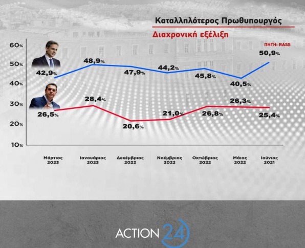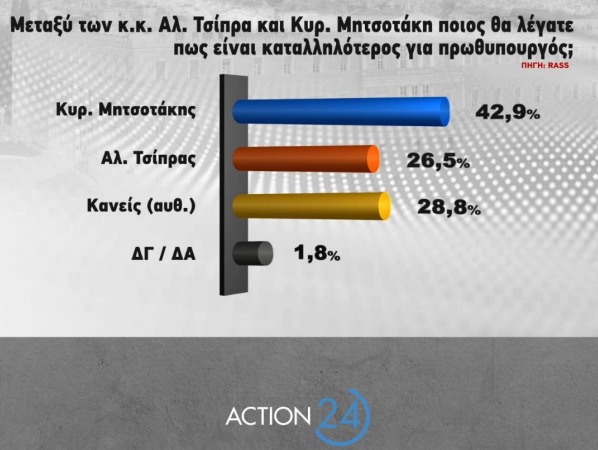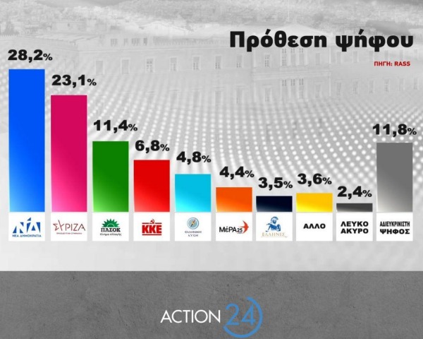 Προβάδισμα 5,1 ποσοστιαίων μονάδων της ΝΔ έναντι του ΣΥΡΙΖΑ εμφανίζει η δημοσκόπηση της RASS που διενεργήθηκε για λογαριασμό του ACTION 24.