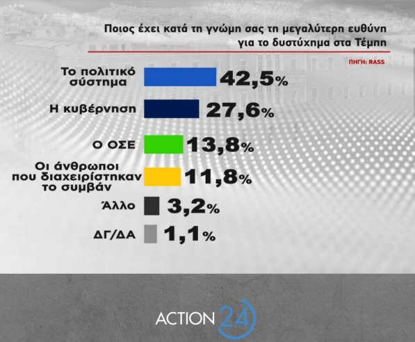 Αναφορικά με το ποιός έχει την ευθύνη για το τραγικό δυστύχημα στα Τέμπη, το πολιτικό σύστημα συγκεντρώνει το μεγαλύτερο ποσοστό, της τάξης του 42,5%, με τη κυβέρνηση να συγκεντρώνει το 27,6%.