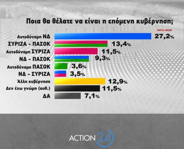 Ενφιαφέρον παρουσιάζει τα αποτελέσματα της ερώτησης «ποια θα θέλατε να είναι η επόμενη κυβέρνηση». Ειδικότερα, το 27,2% επιθυμεί κυβέρνηση με αυτοδύναμη τη ΝΔ, ενώ δεύτερη σε προτίμηση με ποσοστό 13,4% έρχεται η κυβέρνηση συνεργασία ΣΥΡΙΖΑ-ΠΑΣΟΚ. Αυτοδύναμη κυβέρνηση ΣΥΡΙΖΑ επιθυμεί το 11,5% του δείγματος.