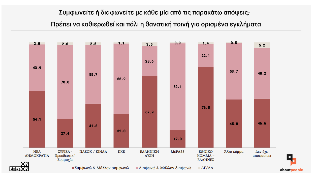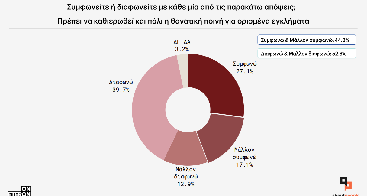Υπέρ της επαναφοράς της θανατικής ποινής, 48 χρόνια μετά την κατάργησή της στη χώρα μας, για ορισμένα εγκλήματα, τοποθετείται το 44,2% των ερωτηθέντων της έρευνας που εκπόνησε το Ινστιτούτο Eteron με τη συνεργασία της aboutpeople.