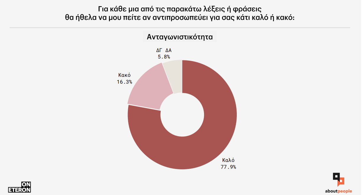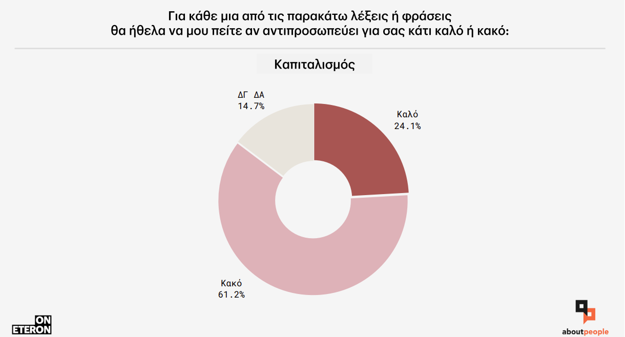 Παρατηρείται λοιπόν ότι παρότι η πλειοψηφία των ερωτηθέντων είναι αρνητικά διακείμενη προς την έννοια του καπιταλισμού (61,2% αρνητική άποψη), εν τούτοις την ίδια στιγμή η έννοια της ανταγωνιστικότητας (77,9% θετική άποψη) αλλά και εκείνη της οικονομίας της αγοράς (54% θετική άποψη) καταγράφουν πλειοψηφικά θετικές απόψεις.