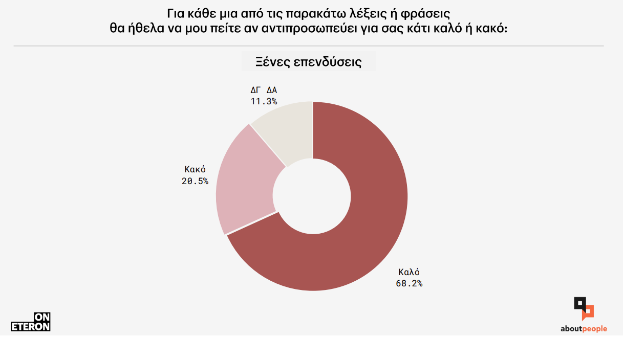 Μία άλλη σημαντική αντίφαση που παρατηρείται στις απαντήσεις του εκλογικού σώματος αφορά τις ξένες επενδύσεις στη χώρα μας και τη δραστηριοποίηση πολυεθνικών εταιρειών. Βλέπουμε δηλαδή το οξύμωρο στατιστικό στοιχείο οι πολυεθνικές εταιρίες να απορρίπτονται με πλειοψηφική τάση (57,3% αρνητική άποψη), την ίδια ώρα που οι ξένες επενδύσεις αντιμετωπίζονται ως κάτι θετικό από μεγάλη πλειοψηφία των ερωτηθέντων, με ένα ποσοστό της τάξεως του 68,2% να έχει θετική στάση απέναντί τους. Με άλλα λόγια, οι Έλληνες θέλουν τις επενδύσεις των πολυεθνικών εταιρειών στη χώρα μας χωρίς όμως να θέλουν αυτές να δραστηριοποιηθούν επιχειρηματικά στην Ελλάδα.
