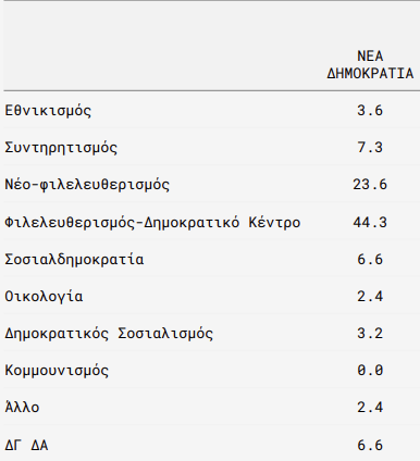 Πηγαίνοντας τμηματικά στους ψηφοφόρους που δηλώνουν πως υποστηρίζουν συγκεκριμένα πολιτικά κόμματα, παρατηρούνται επίσης δομικές αντιφάσεις. Μια από αυτές αφορά τους ψηφοφόρους της Νέας Δημοκρατίας , οι οποίοι σε μεγάλο βαθμό εκφράζονται πολιτικά από τους όρους «Φιλελευθερισμός» και Δημοκρατικό Κέντρο», με μόλις το 10,9% να αυτοπροσδιορίζονται ως «Συντηρητικοί» ή «Εθνικιστές». Την ίδια στιγμή, μεταξύ όσων δηλώνουν ψηφοφόροι της Νέας Δημοκρατίας, το ποσοστό εκείνων που είναι εναντίον στο να θεσμοθετηθεί ο γάμος των ομόφυλων ζευγαριών ανέρχεται σε 51%.