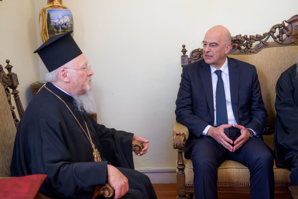 Ο υπουργός Εξωτερικών πραγματοποίησε συνάντηση και με τον Οικουμενικό Πατριάρχη Βαρθολομαίο, ο οποίος μεταβαίνει στη γενέτειρά του, την Ίμβρο, κατά την εορτή του Πάσχα μία φορά κάθε 10 έτη.