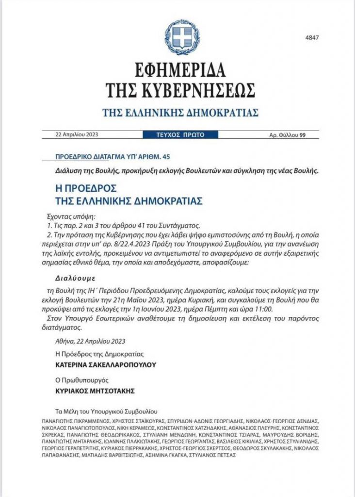 Αυτό ήταν το επόμενο βήμα ώστε να γυρίσει επίσημα η κλεψύδρα για τις εκλογές της 21ης Μαΐου, αφού είχε προηγηθεί η συνάντηση του πρωθυπουργού Κυριάκου Μητσοτάκη με την Πρόεδρο της Δημοκρατίας Κατερίνα Σακελλαροπούλου και η παράδοση του φακέλου με την πράξη του υπουργικού συμβουλίου με την οποία ζητείται η διάλυση της Βουλής και η προκήρυξη εκλογών.