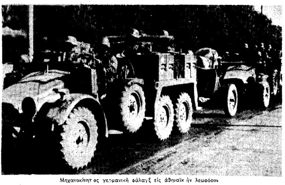 »Την 8ην ακριβώς πρωϊνήν εισήλθον εις την πόλιν από την κατεύθυνσιν της λεωφόρου Κηφισίας τα δύο πρώτα τεθωρακισμένα αυτοκίνητα, ωπλισμένα με εν πυροβόλον και πολυβόλα και φέροντα τους αριθμούς 219, 984 και 296.994, με ελαχίστους στρατιώτας, έχοντας επί κεφαλής τον ανθυπολοχαγόν Φριτς Ντίρφλιγκ.