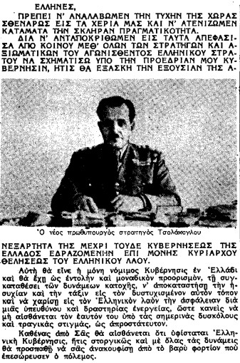 «Ο Δήμαρχος Αθηναίων, επιφορτισθείς υπό της γερμανικής κατοχής με όλας τας εξουσίας εν τη πόλει των Αθηναίων, ανακοινοί ότι σήμερον Κυριακήν 27ην Απριλίου και ώραν 8ην π.μ. τα γερμανικά στρατεύματα εισήλθον εις την πόλιν των Αθηνών και έλαβον κατοχήν αυτής.