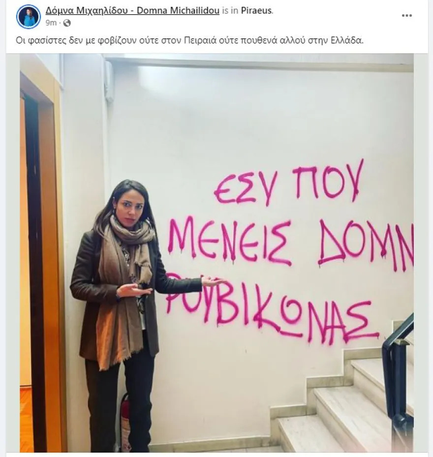 Μέλη του Ρουβίκωνα πραγματοποίησαν επίθεση το απόγευμα της Πέμπτης στο πολιτικό γραφείο της υφυπουργού Εργασίας και Κοινωνικής Αλληλεγγύης Δόμνας Μιχαηλίδου στον Πειραιά. Πιο συγκεκριμένα μέλη του Ρουβίκωνα έγραψαν συνθήματα με σπρέι στον τοίχο του γραφείου της υποψήφιας βουλευτή της ΝΔ στην Α’ Πειραιά.