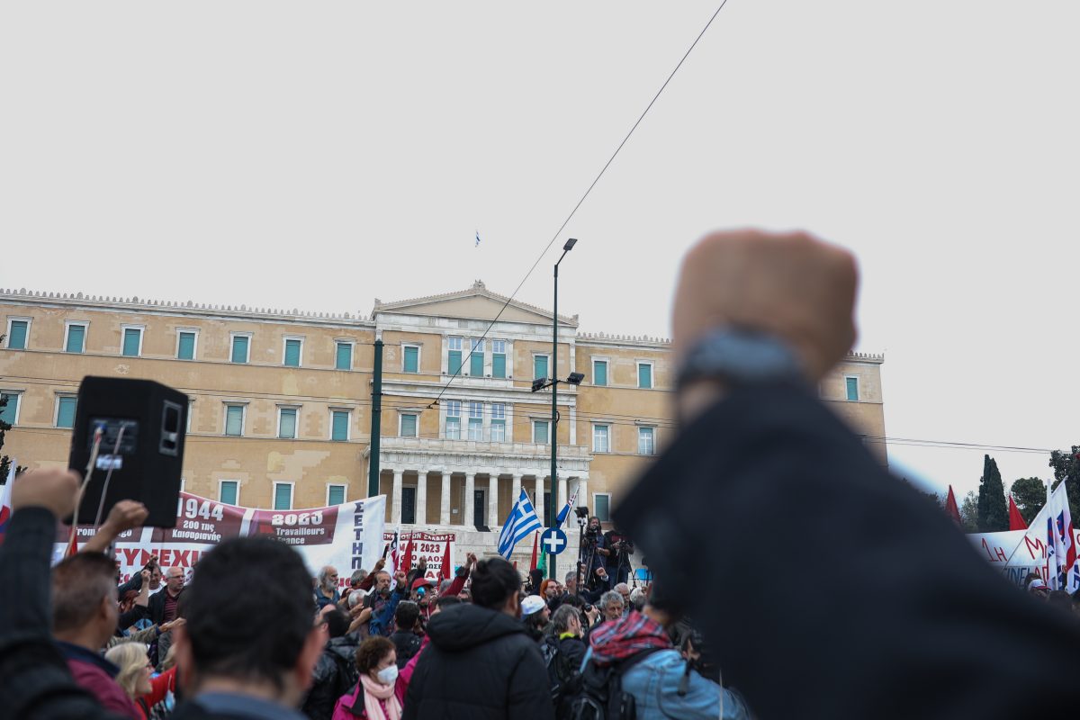 Με υψωμένες γροθιές και τον ύμνο της Διεθνούς ολοκληρώθηκε η μεγάλη απεργιακή συγκέντρωση στο Σύνταγμα. Οι εργαζόμενοι τόνισαν ότι «θα συνεχίσουν αταλάντευτα στον ίδιο δρόμο, δεν θα υποταχθούν στους σχεδιασμούς των επιχειρηματικών ομίλων και του πολιτικού προσωπικού τους, για να πληρώσουν με νέες θυσίες την κρίση και τον πόλεμο».