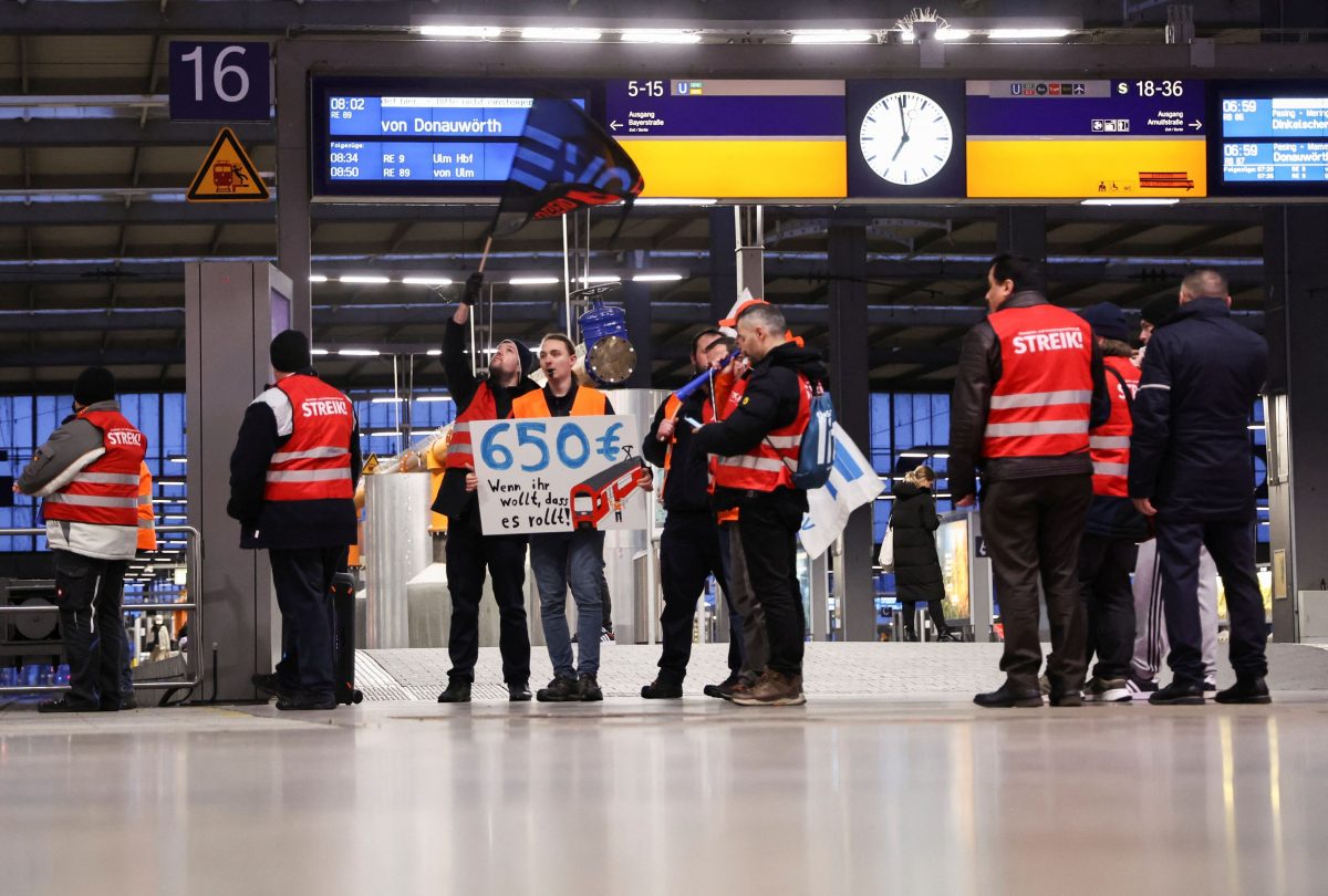 Εργαζόμενοι διαμαρτύρονται στον κεντρικό σιδηροδρομικό σταθμό του Μονάχου κατά τη διάρκεια πανεθνικής απεργίας που κήρυξε το γερμανικό συνδικάτο Verdi για μισθολογικές διαφορές, Μόναχο, Γερμανία, 27 Μαρτίου 2023. REUTERS/Lukas Barth