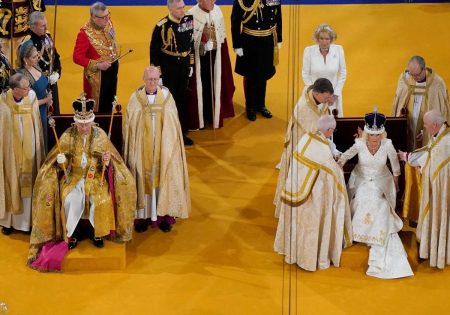 Μετά έγινε η στέψη της Βασίλισσας Καμίλα. Η διαδικασία ήταν πολύ πιο σύντομη, ενώ φόρεσε το στέμμα της Βασίλισσας Μαίρης, της γιαγιάς της Βασίλισσας Ελισάβετ.