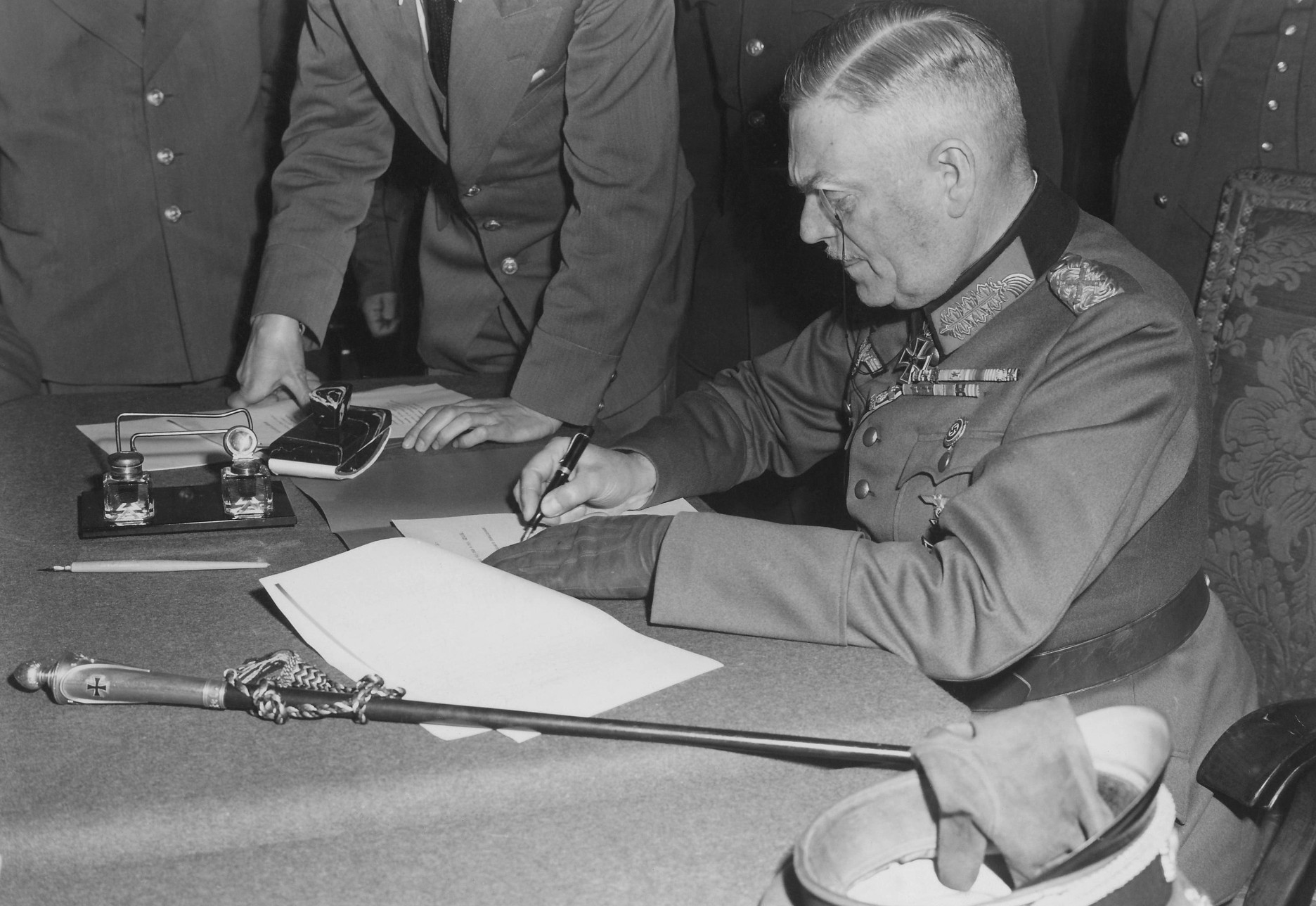 Ο Τέντερ επανέλαβε στα αγγλικά. Ο Κάιτελ, χωρίς να κοιτάξει κανέναν, είπε ένα “ναι”, χαμηλόφωνα. Έβγαλε από τον μικρό μαύρο χαρτοφύλακα που είχε μαζί του τρία έγγραφα, υπογεγραμμένα από τον ναύαρχο Ντένιτς, τον προσωρινό “πρωθυπουργό” της Γερμανίας, που τους εξουσιοδοτούσε να υπογράψουν την “άνευ όρων” συνθηκολόγηση προς τις τρεις συμμαχικές δυνάμεις.