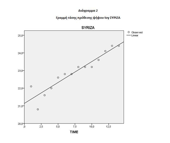 Οι τιμές της πρόθεσης ψήφου του ΣΥΡΙΖΑ για την περίοδο βάσης ακολουθούν τη γραμμική τάση με πολύ καλή προσέγγιση και δεν απαιτείται εξομάλυνση. Παρατηρείται επίσης απόλυτη στατιστική σημαντικότητα των συντελεστών της εξίσωσης παλινδρόμησης2. Η εκτιμηθείσα γραμμή τάσης όπως και οι παρατηρηθείσες τιμές Ιανουαρίου 2022-Φεβρουαρίου 2023 παρουσιάζονται στο διάγραμμα 2. Είναι και εδώ εμφανής η προσέγγιση των ανωτέρω τιμών στην γραμμή τάσης ως και η ανοδική τάση της πρόθεσης ψήφου.